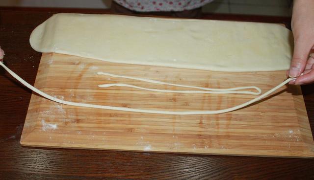 9.把它切成大小几乎一样的面剂子 10.然后手上沾点油,,把面剂子从中间往两边搓, 11.搓成均匀点的长条,若干个。
