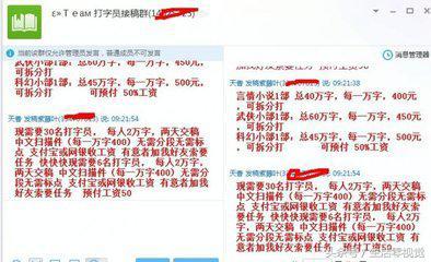 二,兼职打字员骗局 广告语:招聘兼职打字员/打码员。千字15元。游戏挂机一小时5块钱,一台机器可挂20个号。 相信很多人都在群里看到过这样的广告。打字员1000-3000字是15~35块钱的工资够吸引人吧!多简单的工作!此类骗局一般都是先让你加QQ群,加进去以后管理员开始发话,想做打字员的,将以上消息转发到X个以上群,截图发给XXX办理入职……