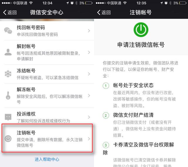 操作步骤:启动微信后进入“我”,随后依次选择“设置”-“帐号与安全”-“微信安全中心”,现在你就可在底部看到“注销帐号”了,直接点击开始你的帐号注销之旅吧,哈哈! 注销帐号有4大前提:1、账号处于安全状态;2、微信支付财产结清;3、卡券清空及微信平台权限解除;4、其他app、网站的账号解绑。