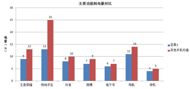虽然坚果3的骁龙625不是特别强悍,但驾驭吃鸡也还是可以的,和636的表现差不多。但625面世时间长,调教成熟,功耗低,坚果3吃鸡一小时耗电13%左右,虽然相比视频要耗电很多,但相比同价位的红米Note5(1小时吃鸡耗电22%)、魅蓝S6(1小时耗电34%),还是要优秀很多。所以吃鸡这一项的表现,坚果3也是值得你信赖的。 三、正常续航相比同价位手机有优势?