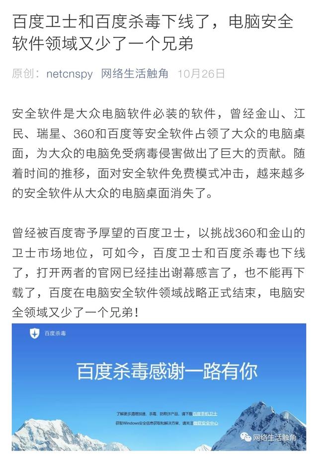 对应当下“动如疯狗”热点追赶速度,这件事更像一个“凉点”。在移动互联网时代,PC端发生的事情,就像热带风暴席卷沿海之际,内陆地区下的一场小雨。 除了官网页面上的一句感谢和“了解更多清理加速、杀毒、防欺诈产品,请下载百度手机卫士”“获取Windows安全信息获取和解决方案,请关注微软安全中心”这样两句“温馨提示”,似乎再无其他声音。连百度百科记录的百度杀毒不再提供下载的消息,也是来自某家早已边缘化的行业媒体。而两个产品的官微也已经停更一年多,最后一条微博都发布于2017年的立秋日,内容是一式两份,连表情包都保持同步。