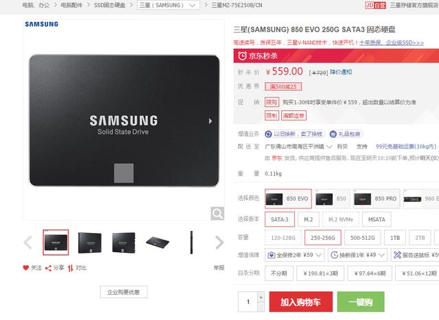 850 EVO 250G SATA3 在固态硬盘市场中,三星属于一线品牌,产品价格相比偏二线品牌,价位自然要贵一些。规格方面,三星850 EVO 固态硬盘采用主流的2.5英寸设计,配备主流SATA3.0接口,容量有120G和250GB等,采用了NAND 闪存,基于三星MGX 控制器原厂主控,具备卓越性能,持久耐用等特点。性能方面,三星850 EVO 连续读取最大540MB/秒,连续写入最大520MB/秒,性能表现主流。作为一线实力SSD厂商,三星850 EVO 具备原厂主控、NAND闪存等特性,具备卓越性能,持久耐用,高效安全等特点,同样提供三年质保,一线品牌,产品质量与售后更有保障。