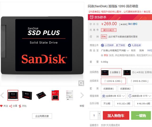 闪迪(SanDisk) 加强版 120G 闪迪,SSDA-Z25加强采用TLC闪存,主控为Marvell 9190,优点就是在主控上了,闪迪固态硬盘在国内也属于比较知名的品牌,今天为大家推荐的第一款SSD型号为闪迪SDSSDA-120G-Z25加强版,性价比突出。外观方面,闪迪SDSSDA-Z25整体为黑色设计风格,外观小巧大气。SSD规格方面,闪迪SDSSDA-Z25采 用了常见的2.5英寸设计,配备主流的SATA3.0接口,容量为120G以及240GB,传输速度写入400M/S,读取可以达到520MB/s,在读取速度方面有不错的表现。 在入门级固态硬盘中,闪迪SDSSDA-Z25加强版凭借亲民价格、稳定等特点,成为一款高销量、98%高好评SSD。此外,该固态 硬盘还配备闪迪Dashboard能监控硬盘的状态和软件的更新,提升了安全性与易用性。此外,提供三年免费质保,很大程度上解决了用户后顾之忧。