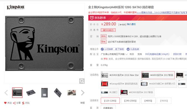金士顿(Kingston)A400系列 120G SATA3 在SSD品牌中,金士顿也是知名品牌,品质有保障,但金士顿的ssd,读写速度非常低,120G的一般都在200M/S的读写,主控一般用的也是JMicron,闪存也是TLC颗粒,推荐的原因是品牌价值和售后有保障,销量也高。 金士顿固态硬盘采用了简约的深灰外观设计,兼容各品牌型号笔记本与台式机,升级方便。 这款金士顿固态硬盘采用主流的2.5英寸设计,使用了19nm制程的闪存芯片,7mm纤薄设计,适用于超级本升级,采用SATA 6Gbps接口,具有传输熟读快,安装方便,方便散热、支持热插拔等优势,240G的最大持续读写速度达到350MB/s左右。 金士顿 固态硬盘最大的亮点除了价格亲民外,将旧硬盘更换为金士顿固态硬盘,发掘计算机的更多潜能。这种经济有效的方式可以大大提升系统性能。易于安装,并享有 3 年保固、免费技术支持以及金士顿品牌可靠的品质保证。