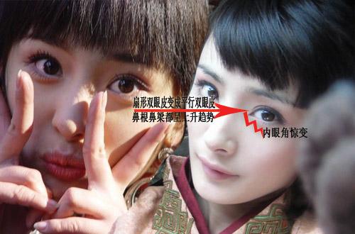 再看这一张,扇形双眼皮强行变成平行双眼皮,鼻梁骨都变成了上升趋势,连内眼角都变了。