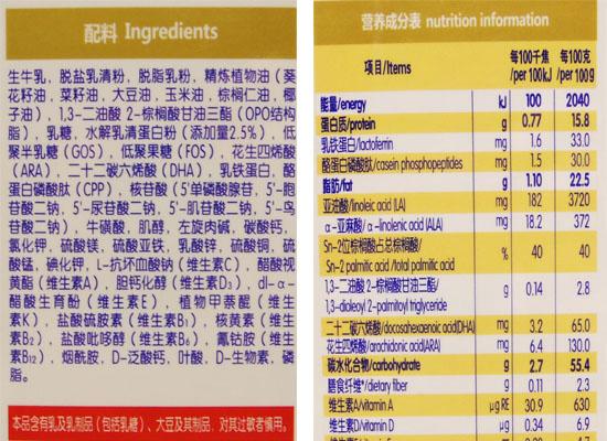 适合6-12个月宝宝 评测分别从配方成分、包装设计、精确量取、组织形态、冲调性以及试饮体验六个方面进行评测。 评测项目一:配方成分评测方法: 拍摄奶粉营养成分表和配料表。 评测结果: