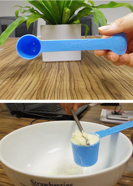 拆开纸盒,可看到盒内有1袋奶粉,采用铝塑密封袋封装,袋内充满了保护气体,底部有一个蓝色的奶粉勺,净含量189g,奶粉属于便携小包装,所以不存在开封后,因时间过久奶粉受潮问题。 但相对罐装奶粉,这种盒装存在一些不足的地方,比如抗挤压性不够,勺子不好安放容易丢失、开封后需用外物夹住开封口、勺取奶粉不如罐装方便等。 评测项目三:精确取量评测方法: