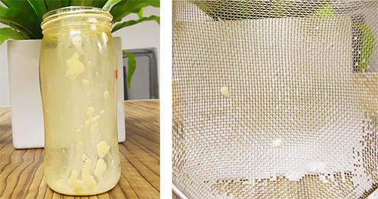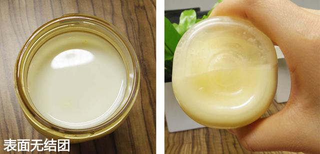 冲调性佳的配方奶粉应该是易溶不结团,底部无残留,瓶身无挂壁。如图所示,冲调好后奶粉表面无未溶结团,奶瓶底部有少量未溶结团。