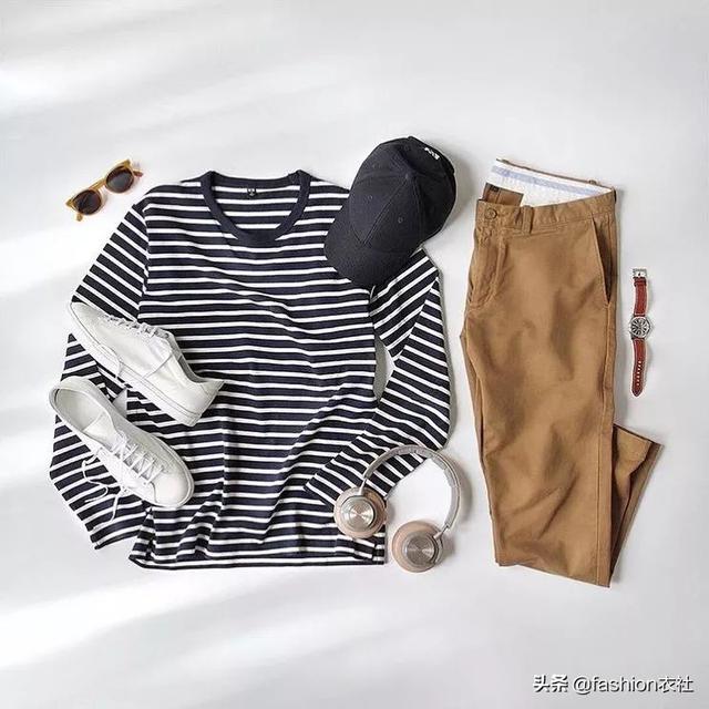 条纹长袖t恤+深蓝色帽子+小白鞋+卡其色休闲裤+墨镜+手表