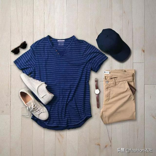 深蓝色条纹体恤+深蓝色帽子+卡其色休闲裤+小白鞋+墨镜+手表