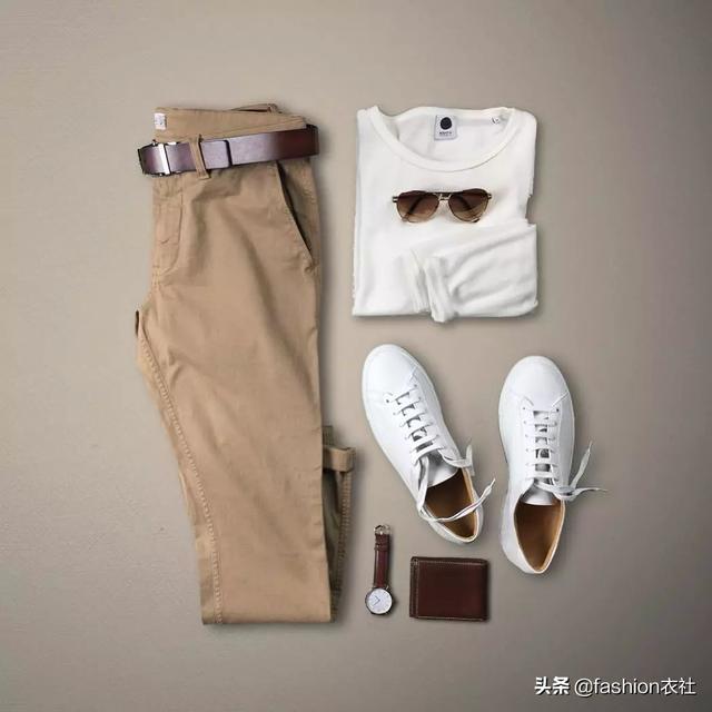 卡其色休闲裤+白色上衣+小白鞋+钱包+手表+墨镜+皮带