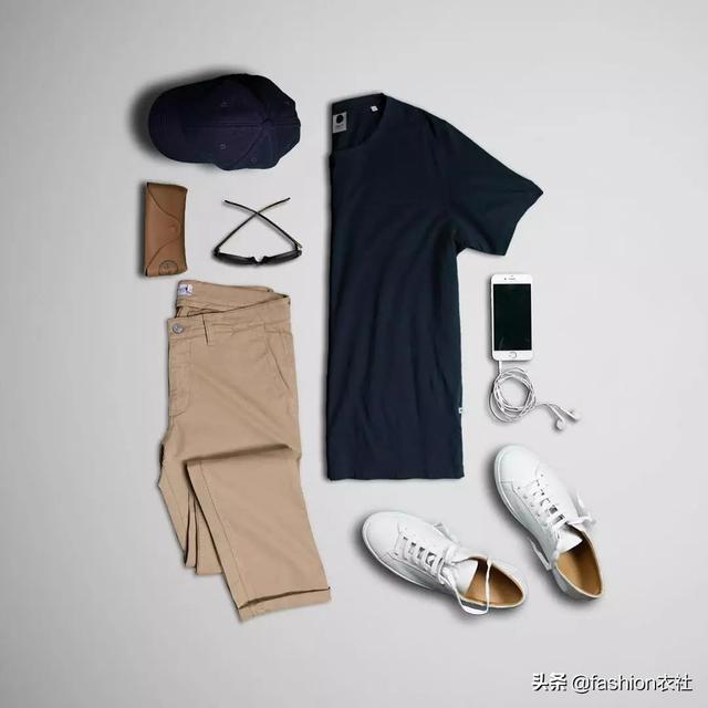 卡其色休闲裤+小白鞋+深蓝色短袖t恤+深蓝色帽子+墨镜+钱包