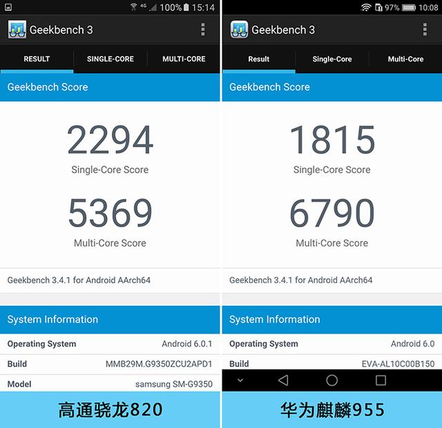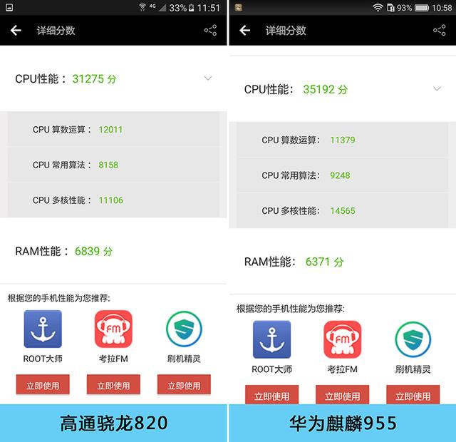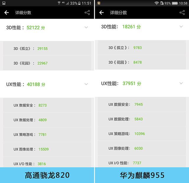 通过安兔兔中综合测试不难看出,在CPU测试部分,拥有八颗CPU运算核心的华为麒麟955小幅领衔高通骁龙820。八核处理器与四核处理器的对比中,理论优势应该是要比这个数据明显的多,但实际并非如此。