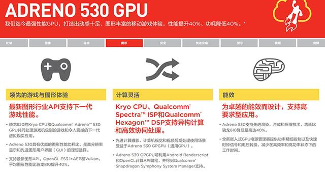 首先来看看高通骁龙820方面,全新集成于骁龙820处理器的Adreno 530是目前高通设计出的最高性能GPU,其提升十分明显。与前代Adreno 430相比,功耗降低高达40%,并且图形和GPU计算性能提升高达40%,其次支持众多领先的图形和计算API,如OpenGL ES 3.1+AEP(Android 扩展包)、Renderscript以及全新的OpenCL 2.0和Vulkan标准。