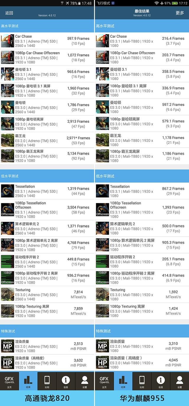 另一边,华为麒麟955方面则没有亮点,相比前代麒麟950没有任何提升,依旧是Mali-T880图形处理器。从ARM官网我们查到了有关Mali-T880的架构图,但图中的版本是完整的16单元核心的T880 MP16,华为麒麟955中搭载的则是其四核心的高配版T800MP4频率900MHz。其他方面基本就是空白,网上和官方也找不到任何详细资料,所以就不多说了直接开始对比。 GPU性能测试 差距显而易见