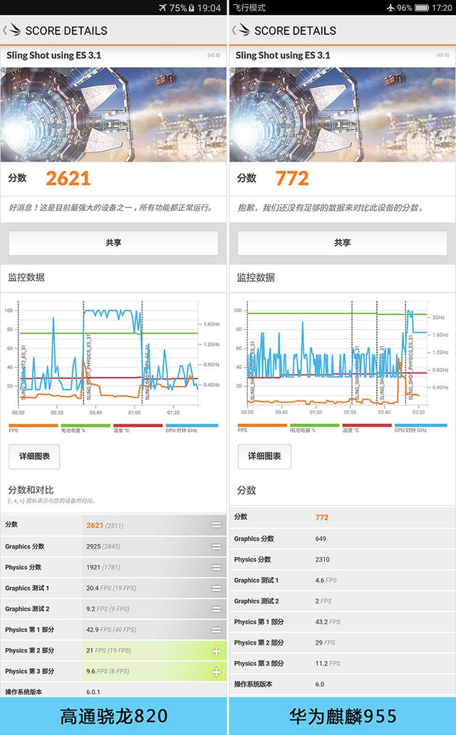 通过安兔兔跑分测试不难看出,骁龙820的GPU得分相当于麒麟955的三倍。毕竟都是号称旗舰级芯片,如此悬殊的成绩,令笔者感到十分诧异。为了印证二者的真实差距,笔者还进行了更多测试。最后还特别录制了一段NBA 2K游戏视频,相信大家看了之后就能明白一切。