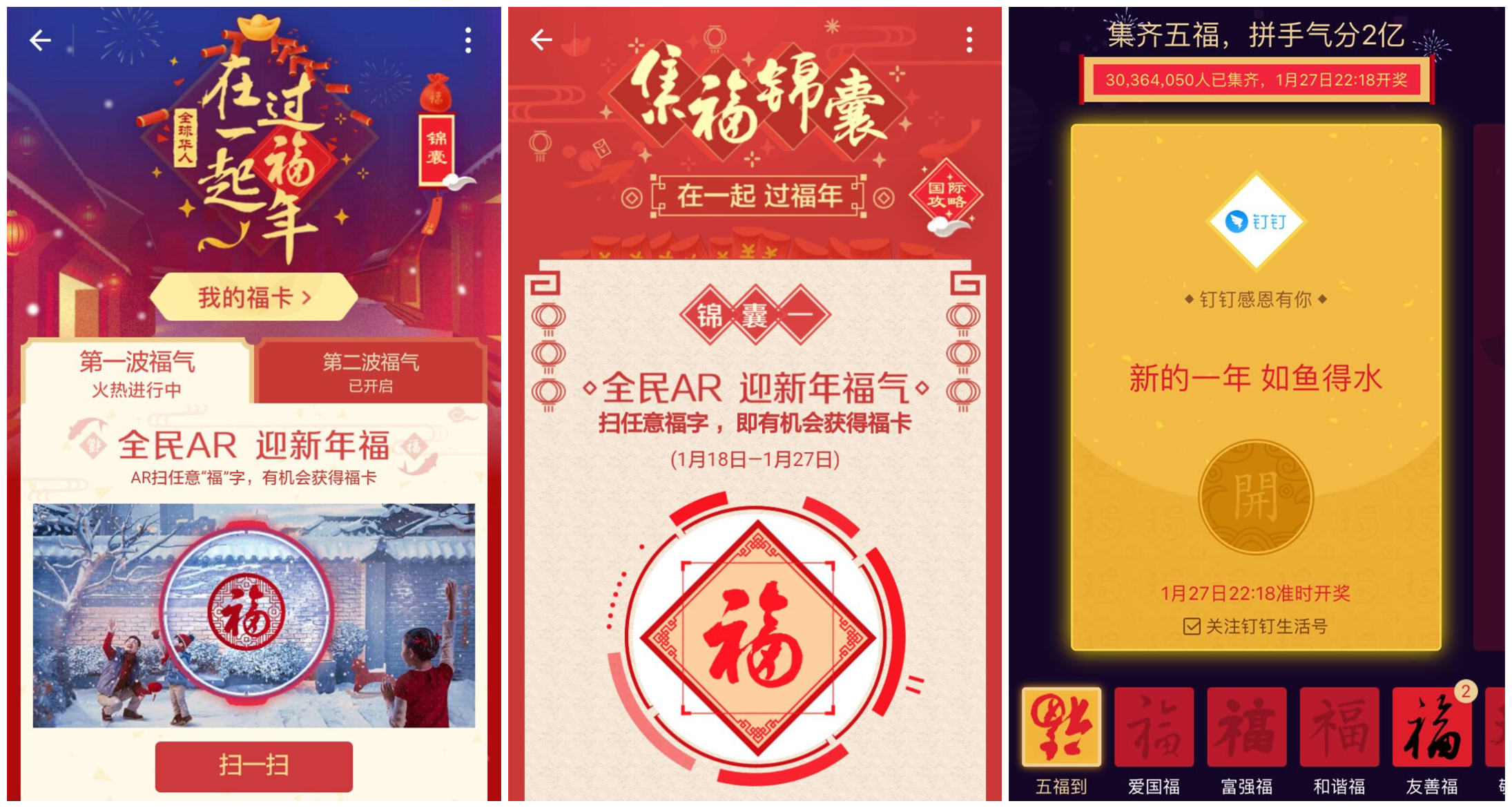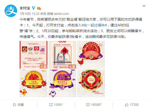 今年的“支付宝集五福”活动,目前为止,已有3000多万人集齐了五福,大家这么踊跃的参与,不一定是想要分到多大的红包,而是一种乐趣。第一轮AR扫任意“福”字,让所有的支付宝用户都有机会获得各种福卡,没有集齐的用户,就会找朋友互换,第二轮福卡,通过蚂蚁森林种树或给好友浇水,即有机会获得福卡。所有的方式,都是让用户重在参与,让用户更多的使用支付宝各个功能。 相信这几天支付宝的流量、注册量、互动等各项数据,都是直线飙升的。而通过支付宝、钉钉、微信、QQ等渠道分享“吱口令”的方式把活动更广泛的传播,无论是对支付宝的营销,还是其他企业、品牌参与的营销,应该都是双赢的局面,我们更期待支付宝带来的社交将来会有什么不一样的变化。