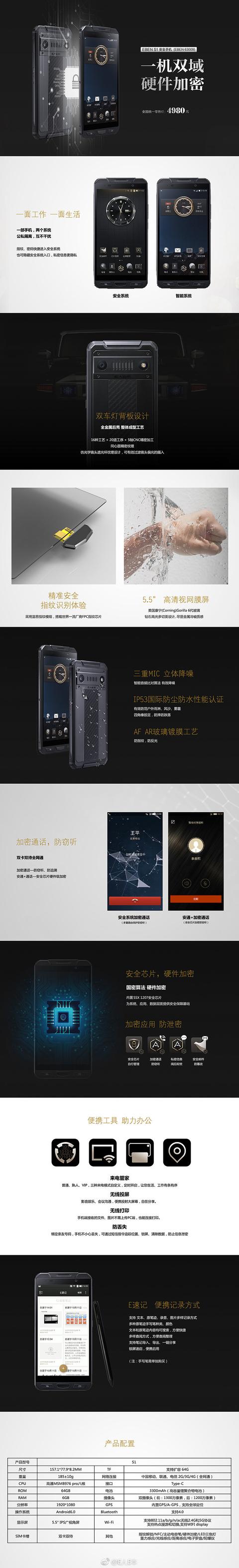 IT之家3月21日消息 今日,E人E本宣布,其首款安全手机S1正式上市,搭载骁龙653处理器,6GB+64GB,售价4980元。 硬件配置方面,E人E本S1手机搭载高通MSM8976 pro(骁龙653)处理器,内置6GB RAM+64GB ROM,5.5英寸显示屏,分辨率1920×1080,覆盖第6代康宁玻璃,支持双卡双待以及64GB TF卡扩容,内置3300mAh容量电池,支持蓝牙4.0以及Type-C接口。 骁龙653处理器于2016年10月推出,4颗1.95GHz A72大核+4颗1.2GHz A53小核,GPU型号为Adreno 510,基于28纳米工艺制造。 拍照方面,E人E本S1采用前置1300万像素摄像头以及1200万主摄像头。其他方面,这款手机支持指纹解锁、NFC、主动电容笔、硬件加密、LED三色灯等。