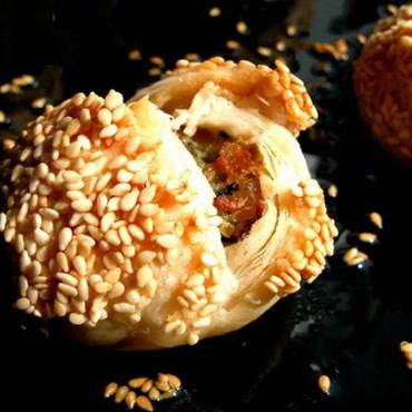 特产4 蟹壳黄 用油酥加酵面作坯,做成扁圆形小饼,面上粘着一层芝麻。贴在烘炉壁上烘熟,形圆,色黄似蟹壳。馅有葱油、鲜肉、白糖、豆沙等。石门一路威海路口吴苑饼家,是供应蟹壳黄的名店。