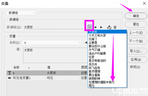 弹出变量窗口,勾选【文本替换】,在名称栏输入a ,就是文本文件第一行的标志,点击【下一个】按钮,