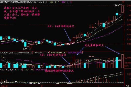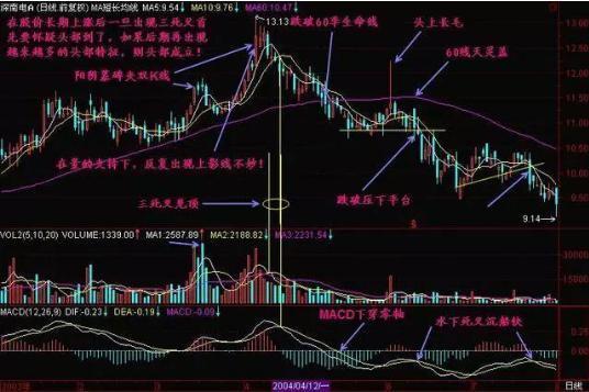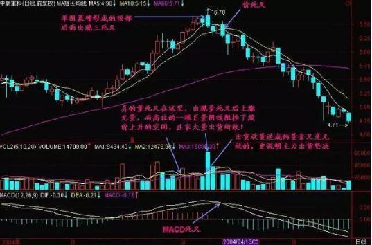 三金叉说明价格、量、MACD都在一个时点附近同时发生良性共振,一般情况下都有一波上扬行情。当三金叉出现在底部区间时,是见底回升的信号。三金叉出现在潜收集之后的强收集时,是强势上攻的信号,比如老鸭头等形态之后出现的三金叉,一旦放量通过鸭头顶就会加速上扬! 三死叉见顶 图形特征: (1)股价在长期上涨后开始进入头部,而后股价缓慢下跌。有时会同时出现5日、10日均价线、5日、10日均量线和MACD的死亡交叉点,这是股价见顶回落的信号。 (2)有时会伴随出现两阴夹一阳空方炮、断头铡刀和MACD下穿零位线等图形。