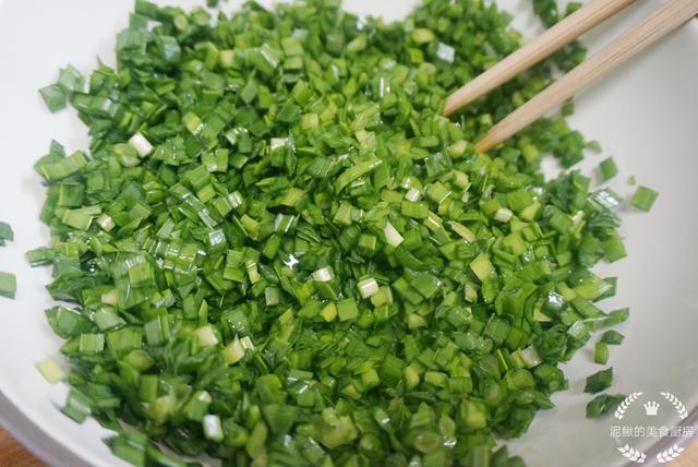 3.韭菜择洗干净,切成小段,先倒入些食用油拌匀防出水,再加入盐和生抽拌匀。
