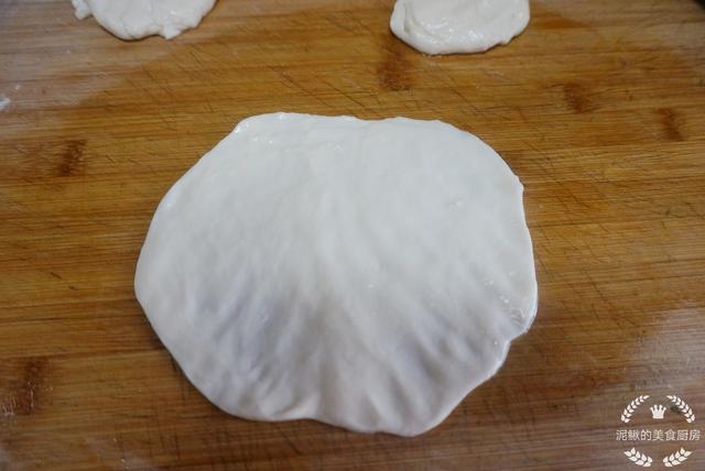 5.案板上抹此油,静置好的面团取出,不要揉,分成6个小剂子。取一个小剂子,擀薄。
