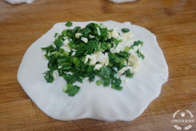 6.在皮中放入适量的韭菜鸡蛋馅儿。