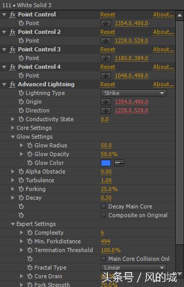 在AE中加效果 这里聊一下闪电的控制方法 下面是主要参数