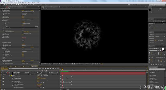 关于不明物体(扩展阅读) Fractal Noise加遮罩做一个从上往下运动 调节Brightness、Offset Turbulence、Evolution让其逐渐消失 再用Polar Coordinates把他变成圆 下图是主要参数
