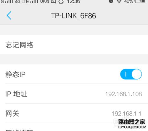 手机:以I0S为例,点击-无线局域网-wifi右边的蓝色感叹号-ip地址选择为【静态】,然后根据路由设置,输入相关参数即可。