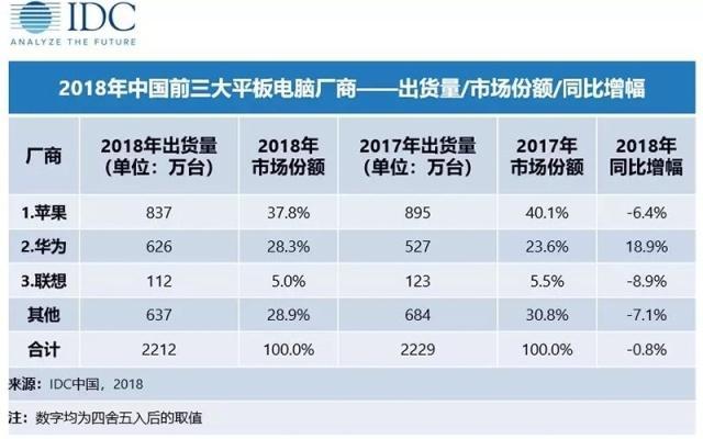 平板电脑作为智能手机品类的“兄弟”,由于显示屏大看电影、煲剧非常方便,相对手机来讲有很强的视野感,从近日,著名数据统计机构IDC发布数据显示,2018年中国平板电脑市场出货量约2212万台,同比下降0.8%,预计2019年,中国平板电脑出货量将达到2252万台,同比增长1.8%。2018年苹果、华为和联想前三大厂商,苹果和联想呈现下降趋势,而华为以18.9%高速增长中。
