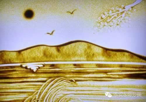 4.抹沙部分 抹沙部分为山体外部轮廓部分,抹沙动作一般为手掌张开或者半握拳等,用靠近小指手掌外侧抹沙,常用处就是一些物体外部轮廓曲线部分。 5.漏沙部分 太阳部分、用到了漏沙手法; 漏沙动作一般为手抓沙握拳,向下漏沙子,最开始练习可从练习直线、曲线等开始练习;漏沙手法在沙画里是用到很多的手法之一,希望大家勤加练习加以掌握。注意事项:握拳不用很紧,抓沙适量而行,不要太多,以免控制不住沙子。 6.拍沙部分 太阳部分、枝叶部分用到了拍沙的手法; 漏沙完毕后,用手掌部分画圆部分,轻拍沙子,拍出太阳的光晕部分;此手法 需要反复练习,掌握好力度与角度才能掌握好光晕的大小与美观度。 7.捏沙部分 大雁部分用到了捏沙手法,拇指与食指捏少量沙子,两指稍错位捻一下沙子,使小部分沙子漏下成为大雁的翅膀;此手法常用大雁、眉毛、睫毛等细节部分。 以上文字部分均为个人整理几种常用沙画手法结合于分析,有时间会不断更新新的沙画内容,有不足欠缺的地方大家交流补充,也希望大家从最基础的手法开始练习学习,为以后部分打好基础;自学者多主要分析,注意老师手上动作,反复研究练习,相信,一定可以掌握的很好! |