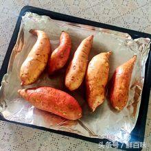 ?3.烤盘铺上锡纸,哑光面朝上。 ?4.将红薯放在烤盘上。 ?5.放入烤箱,中下层200°烤30分钟。