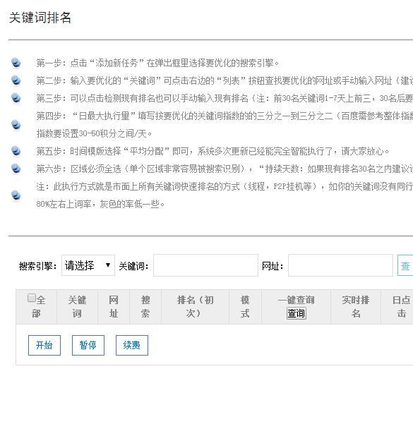 SEO圈一直流传关键词快速排名三天上首页的传说,淘宝搜索这样的关键词也是有一大堆提供服务的团队。 怎么样让网站关键词在三天之内就上升到首页了?这样的操作是不是会被搜索引擎认为作弊?相信很多SEOER都有这个疑问,也对这种操作方法半信半疑,下面CRAZYSEO工程师就为大家揭开这个秘密,相信阅读完本小节后大家一定能找到上面两个问题的答案。 使用点击器快速获得排名是基于搜索引擎通过用户的搜索跳出率调整网页排名而来,在网站关键词排名进入到前20位之后,用户的点击浏览行为将作为搜索引擎判断网页质量的重要指标,出于这样的原理,现在出现了很多软件,这种软件可以自动浏览并且点击网站,很多软件都做到很人类的操作非常相似,能自动翻页、前进、后退,让搜索引擎无法识别。 现在大体有这样的两种类型,一种是直接缴费,缴费后便有很多安装该软件的机器点击网站,当然安装这些点击器的机器可以赚到相应的费用。还有一种是自己的电脑也安装一个点击器,通过点击别人的网站获取点数,这些点数可以让其他机器点击自己的网站。 需要明确的是,点击器的适用范围一般都是要进入前20位,超过这个位数点击器起不到重要的作用,其次是即使通过点击器让网站关键词进入到前三,如果没有内容的支撑,一旦点击器停止,排名将很快下降。 CRAZYSEO工程师的建议是可以在一些情况下尝试使用这类型软件,但是一定要将网站的内容质量提升上去,不然也将是昙花一现,再一个使用这类型软件不可操之过急,在使用之前需要分析这个关键词的指数是多少,依据这个指数安排点击量,如果一个200指数的关键词,我们安排1000次的点击量,这样很容易会被搜索引擎认为是作弊。 这类型工具非常多,读者可以自行搜索了解。下面我们分析一下该类型工具某一个网站的功能,这个网站主要功能如图1: