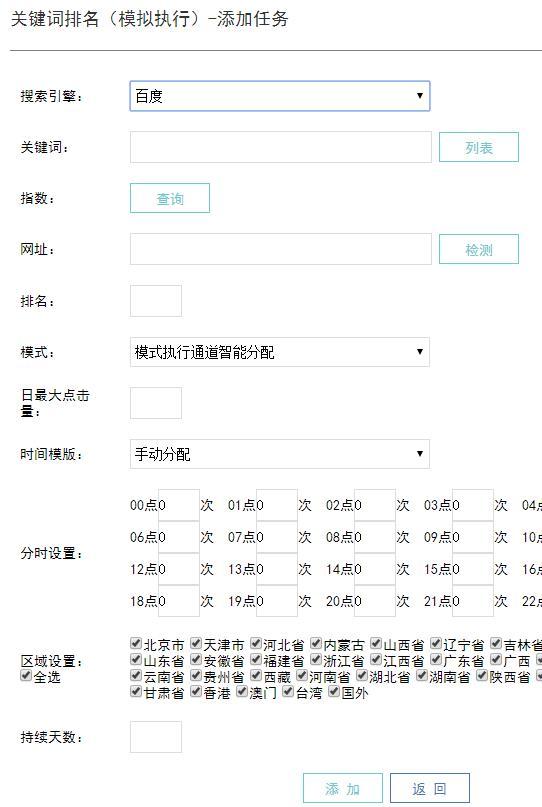 图6 可以看到搜索“外链建设”这个关键词的用户集中的省份,依据这个数据设置点击的区域。这样细致的分析、设置能降低百度搜索引擎认为是作弊的风险,因此是非常有必要的。 全部设置完成后点击“添加”,任务就可以执行了,执行的过程中我们不需要再进行说明操作。 如图7: