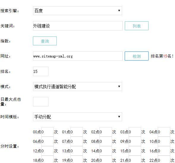 图5 可以看到关键词“外链建设”排名第15位,需要注意的是排名没有进入到100名之内是无法使用点击器操作的。 最后还需要设置日最大点击次数、分时和区域,日最大点击次数建议控制在关键词指数的50%左右,100指数的关键词,设置日最大点击次数50即可。分时设置需要分析一下网站所属行业的用户上网时间段,区域可以使用百度搜索引擎ndex.baidu.com工具,如图6:
