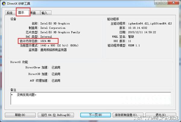 2、在弹出“DirectX诊断工具”界面之后,切换到“显示”选项卡,然后在显示界面中,就能够看到显卡信息以及显存大小了。