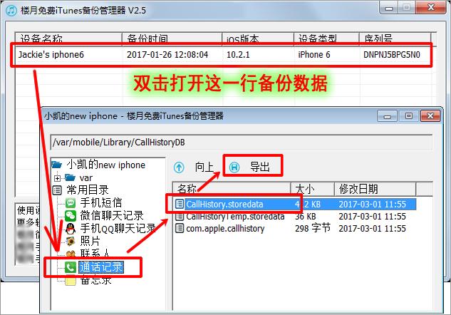 3,在百度上搜索下载安装楼月免费iTunes备份管理器,通过该软件把苹果手机备份数据中存储了通话记录的CallHistory.storedata文件导出到电脑上。
