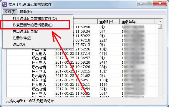5,现在与该手机号码有电话往来的号码就都显示在了界面上,包括所有呼入电话和呼出电话,但目前看到的还只是没有删除的电话号码,如果要查看人为不小心删除的通话记录的话,请点击文件,恢复已删除的通话记录菜单。