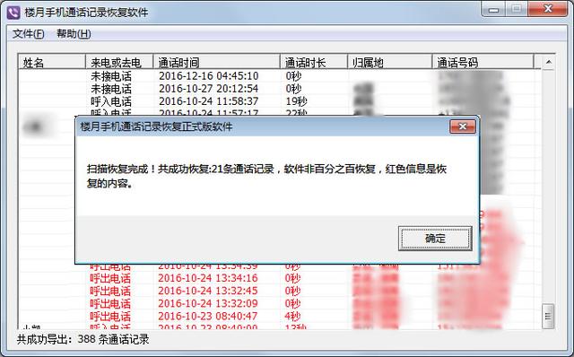 6,软件扫描通常比较快,几秒钟就扫描并恢复结束了,关闭扫描完成的提示窗口后,就可以在界面上查看到删掉的通话记录。未接电话,已接电话,以及播出电话,以时间先后顺序,平铺在了窗口上。