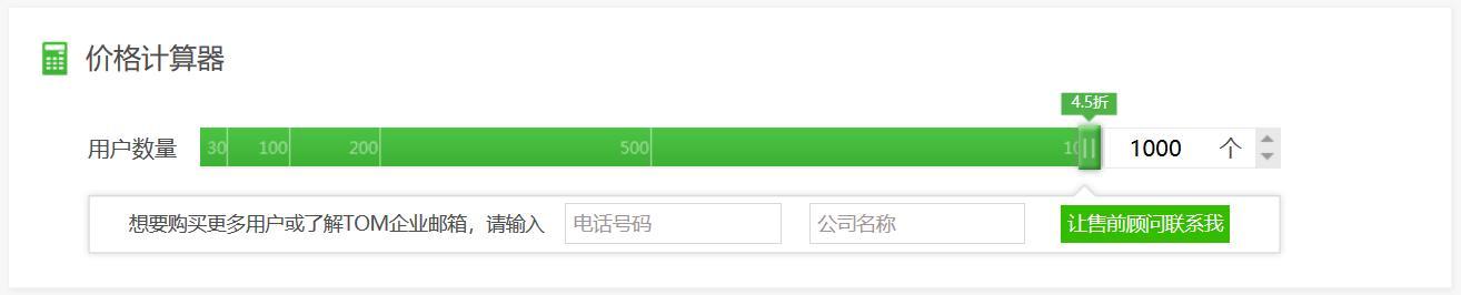 第二步:把页面拉到中间位置,在价格计算器上把滚动条拉到最大,出现需要填写的电话号码和公司名称,填写后点击【让售前顾问联系我】