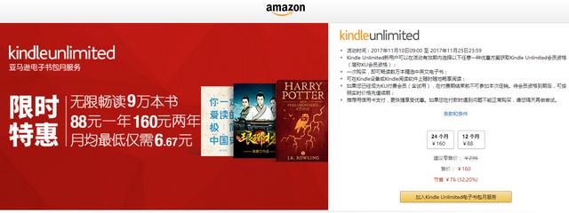 近日,亚马逊Kindle商店开启了一项促销活动:Kindle Unlimited新用户只需要88元/年,就能享受原价144元/年的电子书包月服务。 但已经成为KU付费会员(含试用),在付费期结束前不可参加本次促销。待会员资格到期后,可按照实时价格充值续期。