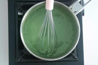 【抹茶蜜豆奶油蛋糕】 所需食材:淡奶油120克 纯牛奶120克 抹茶粉7克 糖粉25克 蜜豆60克 雪糕模具4个 制作步骤:将纯牛奶倒入锅中,加入10克糖粉搅拌均匀,然后开小火让它这样熬,熬到开始冒泡泡了就可以关火了。将抹茶粉倒入小碗中,然后把煮好的牛奶舀两大勺倒进去搅拌,搅拌成面糊状就好了。看着这抹绿,是不是觉得很美好啊。
