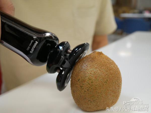为了让大家更直观地看到奇异果的剃毛效果,这是桌子上奇异果先生遗留下来的毛发。 小结:感谢奇异果先生的英勇就义,回去以后笔者已经很好地享用了它剃毛后的口感。如图所示,我们可以看到该款剃须刀不仅能给人类剃毛,在给水果剃毛方面也是没有问题的。 4 高性能与低损耗同时兼具 拆下刀网启动剃须刀是一项很危险的行为,笔者如果误触高速震动的内刀头可能会造成割伤手指。然而协助拍摄视频的小哥勇敢地承担起责任,做好安全防护措施,为大家拍摄了上面的视频。 飞利浦剃须刀S586采用荷兰进口刀头,最薄部分只有0.06mm,充分贴合皮肤,自动研磨刀片,锋利持久。剃须刀内部的18片迷你刀片,37800次/分高速的转速实现平滑剃须,上面的视频可以让大家直观地感受该款剃须刀马达的强劲。