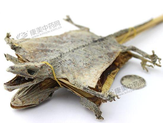 1.正品蛤蚧特征正品蛤蚧多用篾片支撑,呈扁圆片状,多为2只相对捆在一起。头颈部及躯干部长9~18cm,头颈部约占三分之一,腹背部宽6~11cm,尾长6~12cm。头略呈扁三角状,两眼多凹陷成窟窿,口内有细齿,生于颚的边缘,无异型大齿。吻部半圆形,吻鳞不切鼻孔,与鼻鳞相连,上鼻鳞左右各1片,上唇鳞12~14对,下唇鳞(包括颏鳞)21片。 其腹背部呈椭圆形,腹薄。背部呈灰黑色或银灰色,有黄白色、灰绿色或橙红色斑点散在或密集成不显著的斑纹,脊椎骨和两侧肋骨突起。四足均具5趾;趾间仅具蹼迹,足趾底有吸盘。尾细而坚实,微现骨节,与背部颜色相同,有6~7个明显的银灰色环带,有的再生尾较原生尾短,且银灰色环带不明显。全身密被圆形或多角形微有光泽的细鳞。气腥,味微咸。