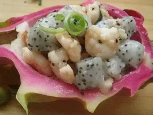 火龙果烩虾仁 主料:虾(250克)、火龙果(半个)调料:鸡蛋清(我放一个有点多了(一个)、葱(适量)、生姜(适量)、淀粉(适量) 做法: 1、虾去外壳、腥线流水冲洗干净。 2、将虾仁加入盐、淀粉、生姜、鸡蛋清腌渍15分钟。 3、火龙果对半切开取出半边果肉切块,葱切小段备用。 4、锅内加油烧热放入腌渍好的虾仁滑熟捞出。 5、锅内留油下葱段炒香。 6、加入火龙果块炒匀。 7、再加入虾仁炒至入味。 8、最后再鸡精炒匀即可出锅装盘。 4、紫薯火龙果糖水