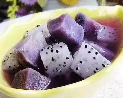 紫薯火龙果糖水 主料:火龙果(适量)、花心薯(适量) 做法: 1、准备蒸熟的花心薯,火龙果。 2、花心薯去皮切成丁。 3、将花心薯丁先与适量水一起放锅中大火煮开。 4、加入冰糖。 5、火龙果去皮切丁。 6、水沸后,加入火龙果。 7、大火煮开,转达中小火慢煮十分钟左右,关火闷一会,即可盛出食用。 小窍门:关火后闷一会,可使紫薯的汁色渗入火龙果中,更漂亮。 5、火龙果雪葩 火龙果雪葩 材料:红心火龙果(1个)、白朗姆酒(10ml)、青柠檬汁(10ml)、糖粉(10ml) 做法: 1、红心火龙果去皮,取肉切块; 2、把火龙果肉加糖粉、朗姆酒、柠檬汁; 3、用搅拌机充分搅拌; 4、搅拌后放入不锈钢容器内,覆盖上保鲜膜,放冰箱冷冻; 5、之后放冰箱2个小时候取出,用打蛋器搅拌打散,之后重新放入冰箱冷冻。这个步骤重复2~3次,最后一次打散后取出放入一口杯冷冻后即可食用。 小提示: 1、第五个步骤是关键,直接决定口感,比较花时间。当然,餐厅的雪葩通常都是用专业机器不停搅拌打磨的。 2、雪葩除了可以搭配新鲜水果外,将雪葩和各种酒类混合,也很酸甜适口。同时适量的酒精又能帮助胃部消化,是既好看又好吃的餐后甜品。 6、火龙果酸奶冻