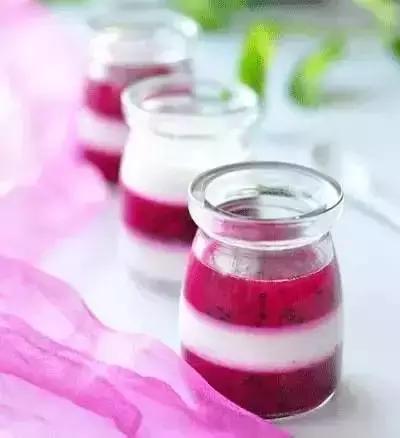 火龙果酸奶冻 材料:红心火龙果(半个)、甜味酸奶(200克)、吉利丁片(3片)、糖(适量)、纯净水(适量) 做法: 1、将吉利丁片浸泡在凉水中软化。 2、将火龙果去皮,果肉切块。 3、将火龙果用搅拌机打成果泥。 4、火龙果泥中加入适量纯净水和糖,共计200克。(如果火龙果够甜可以不加糖) 5、将泡软的吉利丁片隔水融化,平均分成两份。 6、将酸奶倒入一份吉利丁液中搅拌均匀。 7、将火龙果汁倒入另一份吉利丁液中搅拌均匀。 8、将酸奶液或火龙果液倒入瓶中约三分之一的高度,放入冰箱冷藏至凝结。 9、取出布丁瓶,在瓶中倒入另一种颜色的液体至三分之二的高度,放入冰箱冷藏至凝结。 10、在布丁瓶中倒入和第二层颜色不同的液体,放入冰箱冷藏至凝结后即可食用。 小窍门:为了加快凝结速度,我是在冰箱冷冻室完成的制作,每次大约需要20分钟。