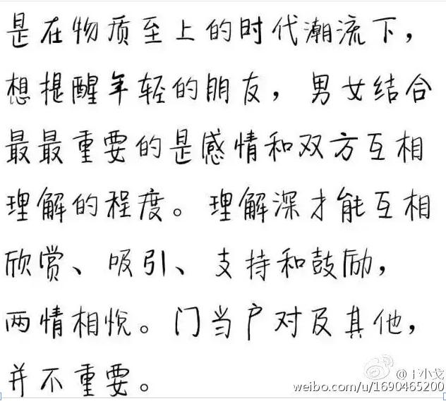 希望不会再有人问:“她是谁,为什么叫先生啊?” 今天,为了缅怀杨绛先生,想再转发几段她说过的话,对任何一个后辈晚生,处于任何人生阶段的你我,都会产生乃至一生的正面影响。 (1)男女结合最最重要的是感情和双方互相理解的程度。理解深才能互相欣赏、吸引、支持和鼓励,两情相悦。门当户对及其他,并不重要。——杨绛